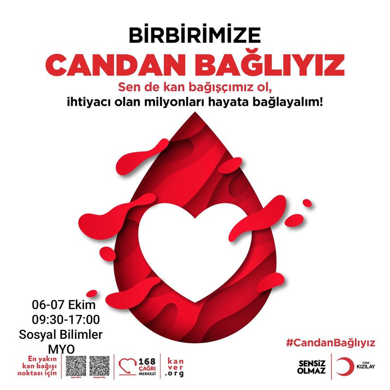 Toplumsal dayanışma ve yardımlaşmanın en güzel örneklerinden biri olan kan bağışı için Meslek Yüksekokulumuzda etkinlik düzenlenecektir.